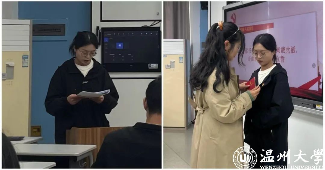 支部书记谢雨琨同志在会上为新吸收的预备党员佩戴党员党徽,并带领他们进行庄严的入党宣誓,党支部明确了入党初心和奋斗目标。