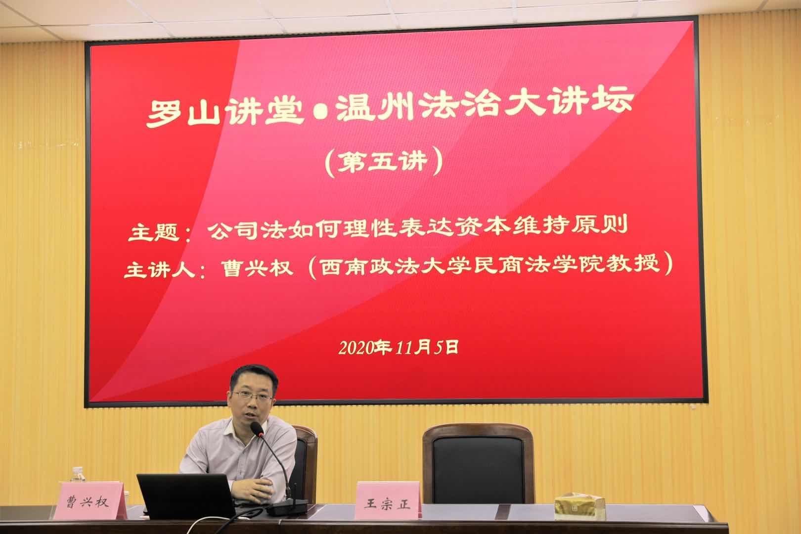 2020年11月5日晚上7点,西南政法大学民商体育博彩平台 教授、博士研究生导师、中国证券法学研究会常务理事、中国保险法学研究会常务理事、中国商法学研究会理事曹兴权教授应邀做客罗山讲堂·温州法治大讲坛,罗山讲堂·温州法治大讲坛由温州市政法委、温州市法学会、温州市律师协会、体育博彩平台 主办,体育博彩 私法研究中心、体育博彩 民商法创新团队协办。