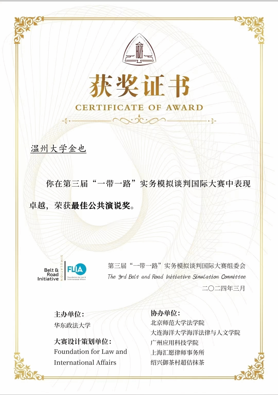 本次比赛主要由华东政法大学主办,为全英文谈判比赛,国内共有65个高校参加,以及来自9个国家的留学生参赛,参赛队伍包括华东政法大学、西南政法大学、复旦大学、武汉大学、中国人民大学、厦门大学等名校。在强者林立的赛场上,体育博彩 代表队通过激烈角逐取得了团体三等奖,国际经贸规则专业22级学生金也因优秀的赛场表现荣获最佳公共演说奖,国际法系李娟老师荣获最佳教练奖,此次我校共获3项奖项。