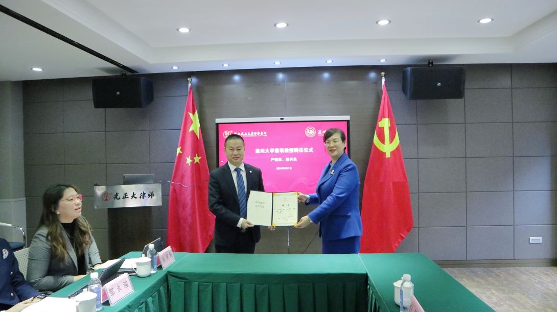 近年来,我校优秀毕业生积极到浙江光正大律师事务所就业,在校生也分批次到事务所实习实践,事务所为人才培养和学生留温就业发挥了积极作用。体育博彩平台 党委副书记、纪委书记杨振海向事务所颁发“体育博彩 2023年度优秀双业双实合作伙伴”纪念证书、递交《感谢信》,浙江光正大律师事务所副主任、市人大代表陈兴良代表事务所接受纪念证书,浙江光正大律师事务所副主任张永谦代表事务所接受《感谢信》。