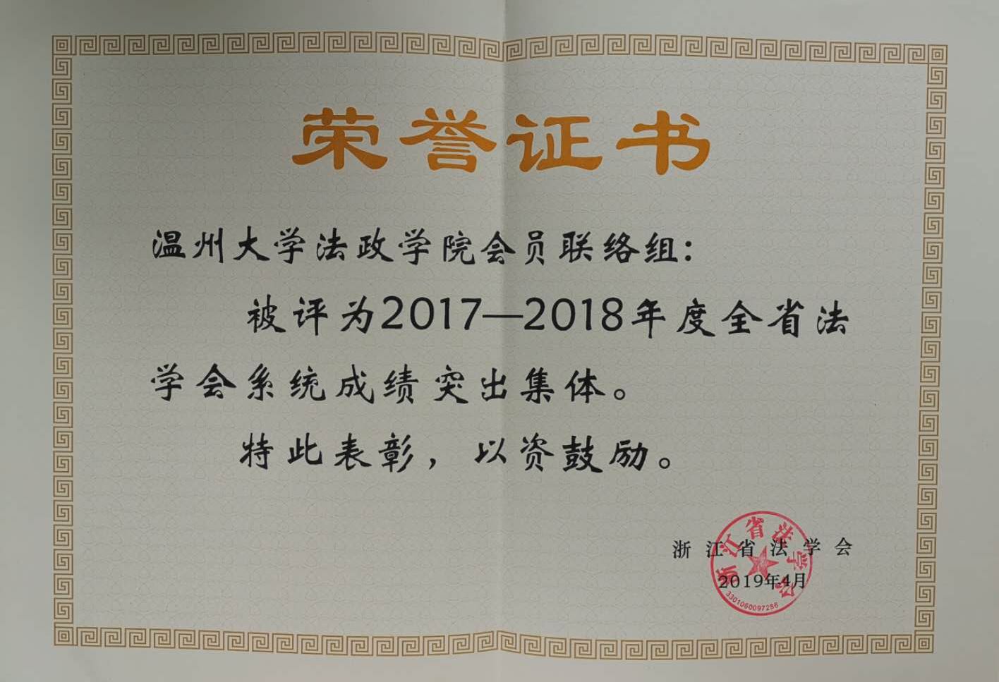 喜报:2019年4月,浙江省法学会为发挥先进典型示范引领和激励作用,推动我省法学事业新发展,决定对省内成绩突出集体和个人通报表扬,体育博彩平台 会员联络组被评为“2017-2018年度全省法学会会系统成绩突出集体”。相信学院会再接再厉,在开展法学研究、法治实践和法律服务方面再创佳绩。