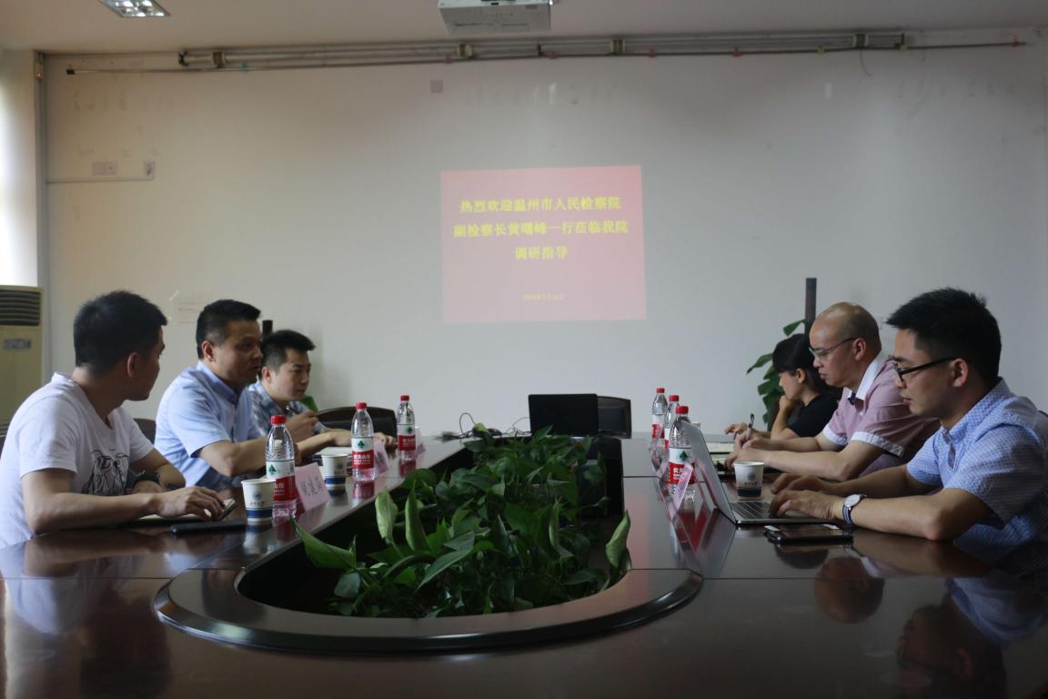 2018年5月16日上午,温州市人民检察院党组副书记、副检察长黄曙峰在市检技术信息化部主任金传拉等的陪同下来体育博彩平台 考察交流,体育博彩平台 王宗正院长、缪心毫副院长、法学系何平主任等与来访嘉宾进行座谈,共商合作事宜。