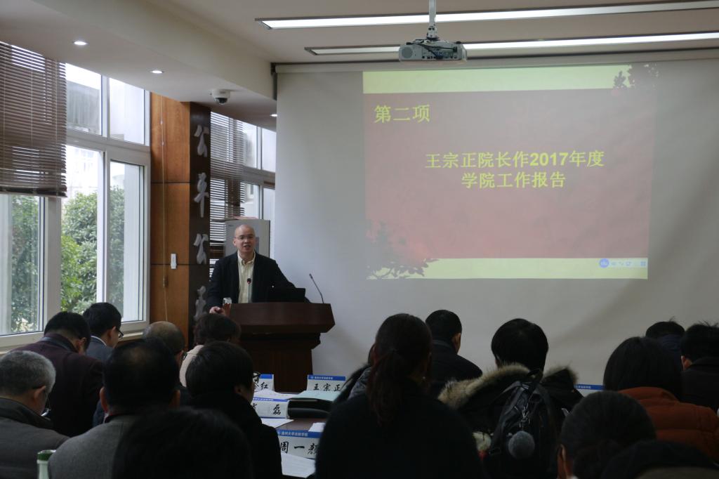 首先,院长王宗正做2017年院长工作报告,报告指出2017年里学院各方面取得了一些优异的成果,如获得了法政学院历史上第一项国家社科基金重大招标项目,体育博彩平台 教师拿到了2017年全国教育规划基金项目等。但肯定成绩、坚定信心时,也应该清醒认识到学院提升发展中的所存在的不足与挑战。同时,布置了2018年的工作规划,全体教师需化压力为动力,推进学院各项事业的新一轮发展。随后,工会委员宾雪花老师作2017年度学院工会工作报告,报告详细回顾了工会关心全院教职工日常生活和组织文体活动做得一切努力和尝试。且对学院领导和全体老师对工会工作的配合和支持予以衷心的感谢。办公室主任朱美宁对学院2017年经费使用做了详细阐述,副院长缪心毫对法政学院的各项提案办理情况进行了说明。