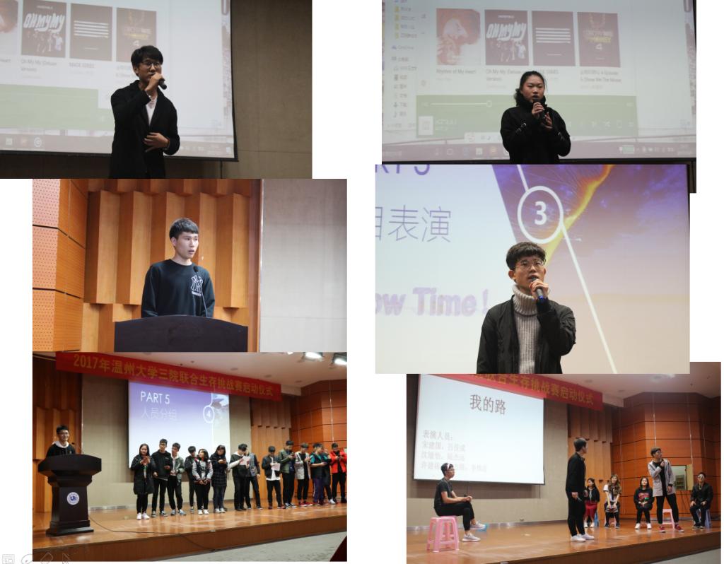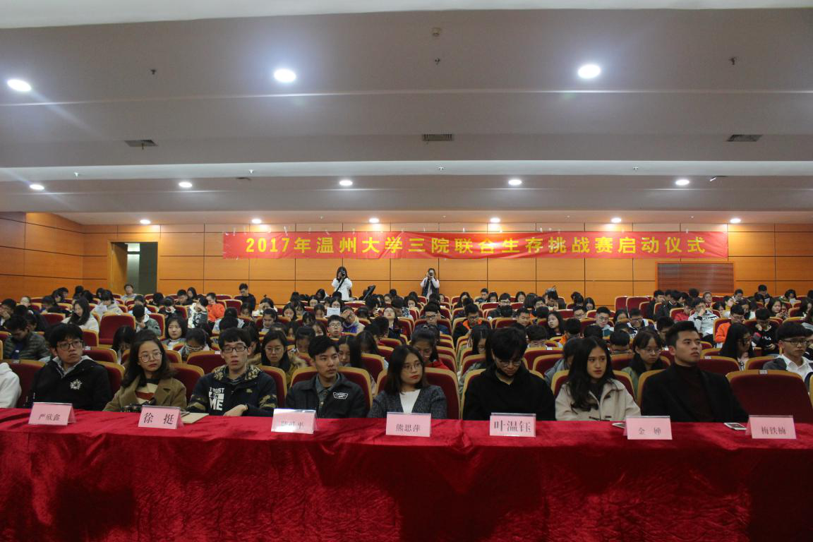 2017年12月1日晚,体育博彩 三院联合生存挑战赛启动仪式在南校雁山厅隆重举行。参与本次启动仪式的嘉宾有体育博彩 保卫科高顺德老师、体育博彩 校团委组织部部长叶温钰、体育博彩 商学院团委学生会主席熊思萍、商学院团委学生会副主席陆叶平,体育博彩 数电学院团委副书记徐挺、数电学院学生会主席严欣鑫,副主席许若源、俞锴磊,体育博彩 法政学院团委副书记金婵、法政学院学生会主席梅铁楠。
