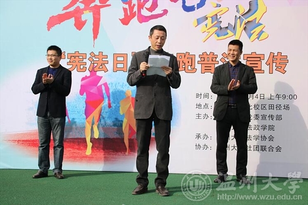 法政学院党总支书记林钦致辞,他谈到了宪法日设立的背景和意义,他说12月4日是我国的宪法日,设立国家宪法日,是推进宪法宣传教育、弘扬宪法精神、加强宪法实施的重要举措,也是增强法治观念、弘扬法治精神、夯实法治基础的有效途径,"奔跑吧,宪法"活动正是为了迎接这一特殊的日子而举办的,师生精心策划的本次活动将宣传宪法日与跑步结合起来别出心裁,希望全体参与者能够践行本次活动的宗旨——让宪法跑进生活,让宪法跑进心里!在学生代表宣誓和慢跑热身活动后本次路跑活动正式开始,路跑的终点处每一位参与者都领取了一本纪念版《中华人民共和国宪法》和本次路跑活动纪念徽章。