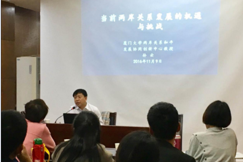 2016年11月9日,体育博彩平台 荣幸邀请到著名学者、厦门大学台湾研究院博士生导师、厦门大学两岸关系和平发展协同创新中心重大理论平台执行长孙云教授,就"当前两岸关系的机遇与挑战"问题,与本院师生进行学术交流。讲座在法政学院一楼报告厅举行,吴玉宗教授担任主持人,王勇副院长、付翠莲教授、徐旭东、朱婉菁等老师参加了此次学术活动。