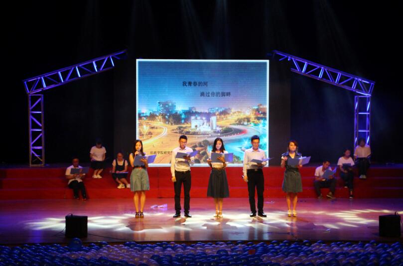 王杰、尹钰担任。法政学院领导、师生齐聚一堂,用一幕幕饱含深情的演出,诉说着心中难以掩藏的情愫。老师、同学陆续到达后,大屏幕上开始播放视频,屏幕上出现的是曾经不以为意、现在却看到落泪的一幕又一幕,勾起大四学子们对青春的回忆。活力动感的开场舞《给力青春》结束后,主持人宣布晚会正式开始。