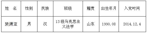 经过一年的预备考察期,经支委会讨论,准备近期召开支部大会讨论裴潇亚 同志转正事宜,现予以公示:公示期限为11月 27日—— 12月3日,如对该同学有异议,请向法政学院辅导员办公室孙德升老师反映,或以电子或书面材料形式反馈意见。