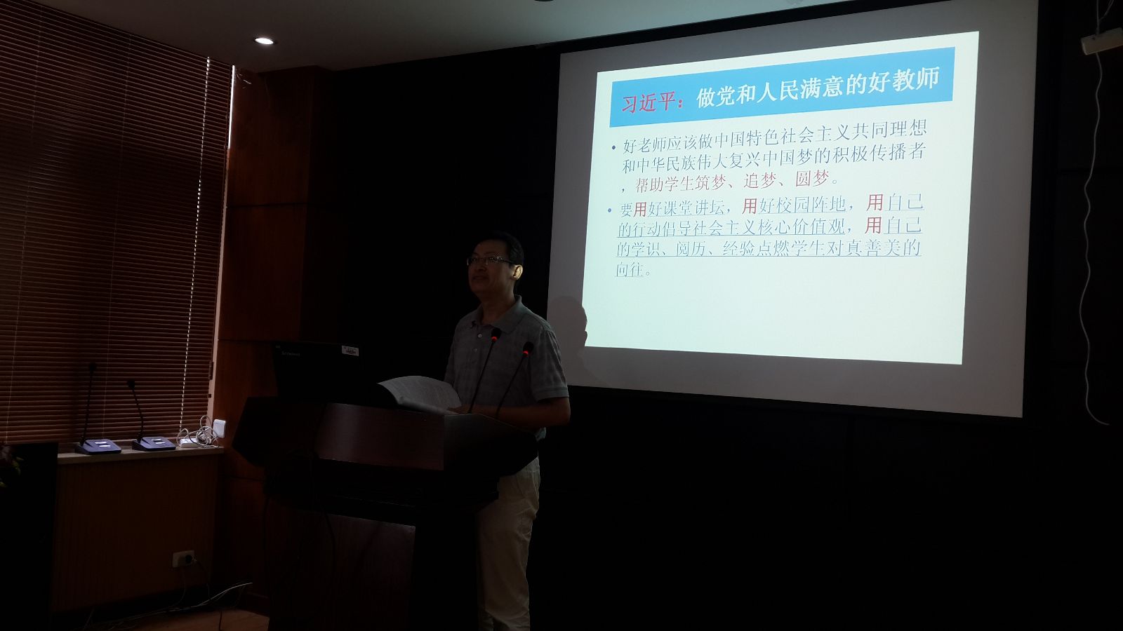 在李斌老师的交流发言之后,王柏民书记在会上做了题为"深刻领会习总书记重要讲话精神,努力做一名好教师"的动员报告,要求学院广大教师认真贯彻学校党委《关于认真学习贯彻习近平总书记教师节重要讲话精神的通知》的精神,把习总书记教师节重要讲话作为"新时期教师教育工作的纲领性文献"和"进一步加强教师工作的行动指南",要认真对照习总书记提出的"好教师"的标准,结合我校师德师风建设中实际存在的突出问题,积极推进实施学校的"五温"工程,切实履行好"立德树人"的教师职责。