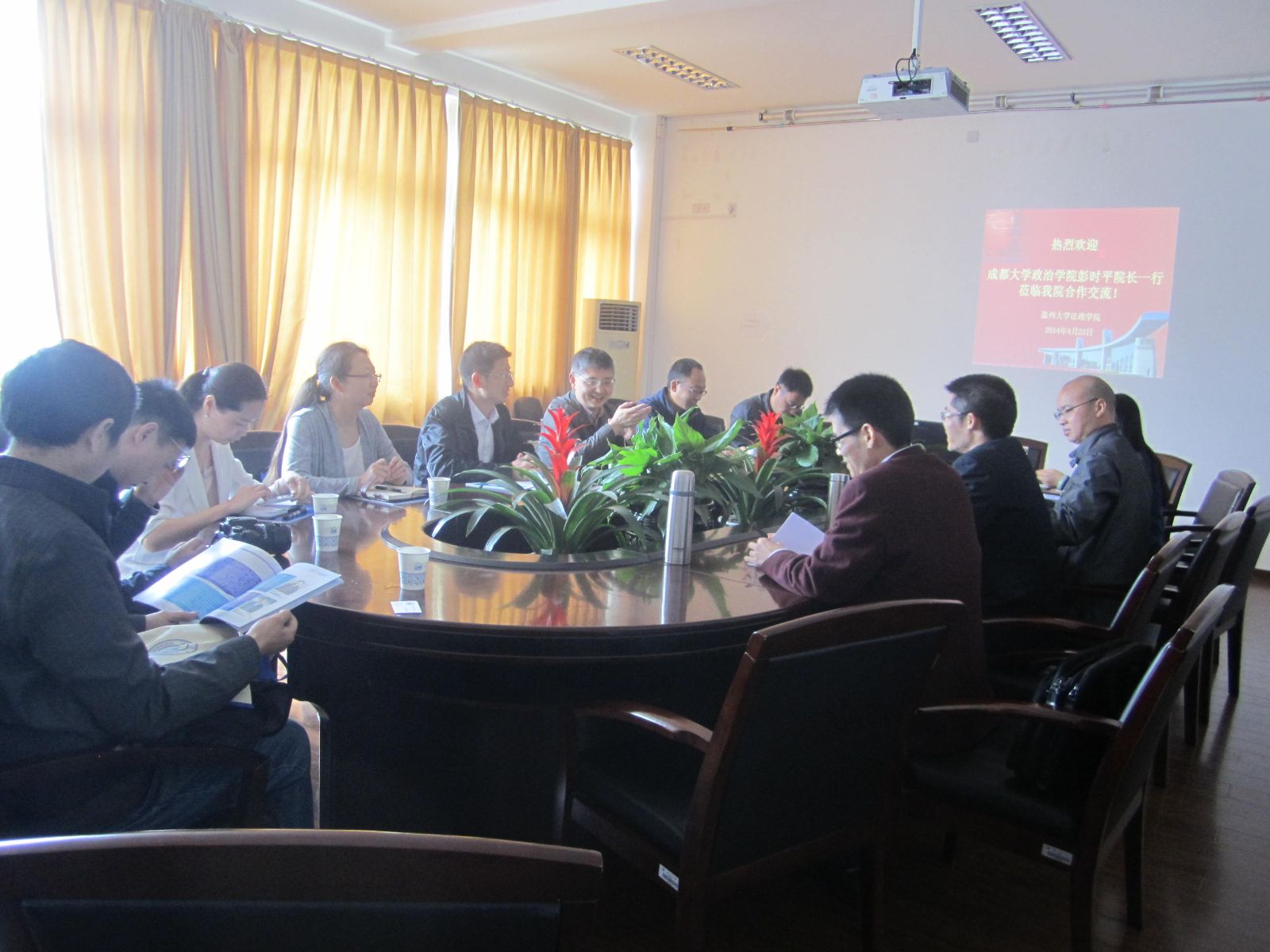 4月23日上午,成都大学政治学院彭时平院长一行8人莅临体育博彩平台