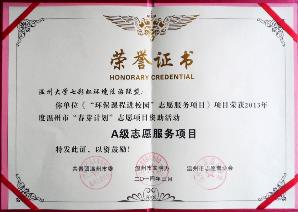 3月5日下午,温州市志愿服务工作委员会在市人民大会堂四楼新闻厅隆重举行2014年"温州市学雷锋志愿服务工作会议暨温州市志愿者协会四届二次会议"。体育博彩平台 七彩虹环境法治联盟(社团)荣获2013年度温州市"春芽计划"志愿项目资助活动"A级志愿服务项目",充分展现了体育博彩平台 学子关注社会,服务社会的精神。