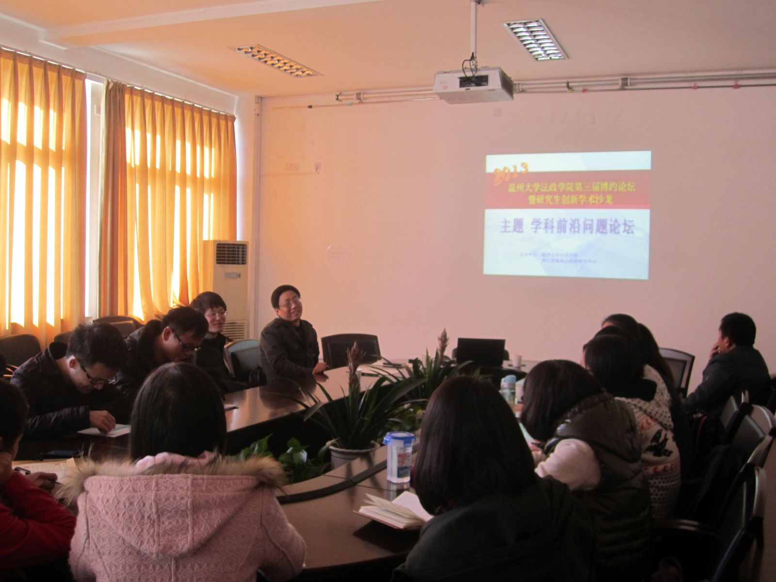 11月29号下午3点,体育博彩 法政学院第三届博约论坛暨研究生创新学术沙龙在法政学院307会议室召开,这次论坛由体育博彩 法政学院和浙江省温州人经济研究中心主办,论坛主题为探讨学科前沿问题。来自法政学院的多位老师和研一、研二的研究生参加了此次论坛。