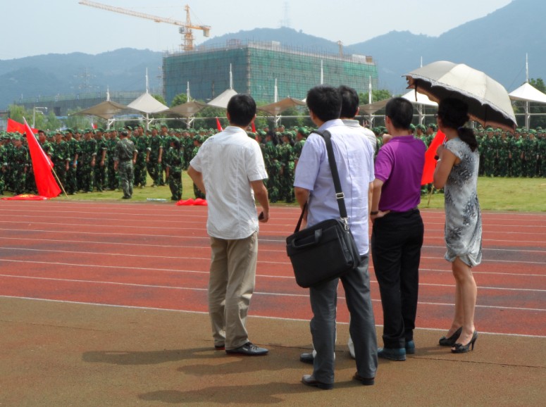 2013年9月11日上午,体育博彩平台 院长钭晓东、党总支书记王柏民、党总支副书记严玲红、行政管理系主任陈宝胜、辅导员白昌科等老师,一同来到军训场亲切看望并慰问法政学院2013级新生及军训教官。走进位于体育博彩 北校区足球场的军训场,正遇到各营列队集合,方阵整齐,步伐一致,场面壮观。为了不影响正在进行的列队活动,各位老师向负责军训现场的辅导员了解军训情况,并在场观看军训演练。正在军训的同学们看到学院领导和老师的到来,深受鼓舞,展示了最帅气的军姿。他们精神饱满、充满自信、不畏辛苦的风貌也深深打动了各位老师。