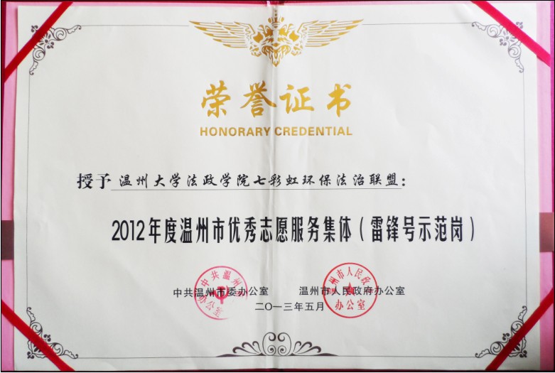 体育博彩平台 七彩虹环保法治联盟在2012年度开展了内容丰富、形式多样的环保公益活动,为我市"三生融合·幸福温州"的建设做出了 贡献,发挥了大学生环保社团"实践育人·服务社会"的积极作用,荣获"2012年度温州市优秀志愿服务集体(雷锋号示范岗)" 称号。