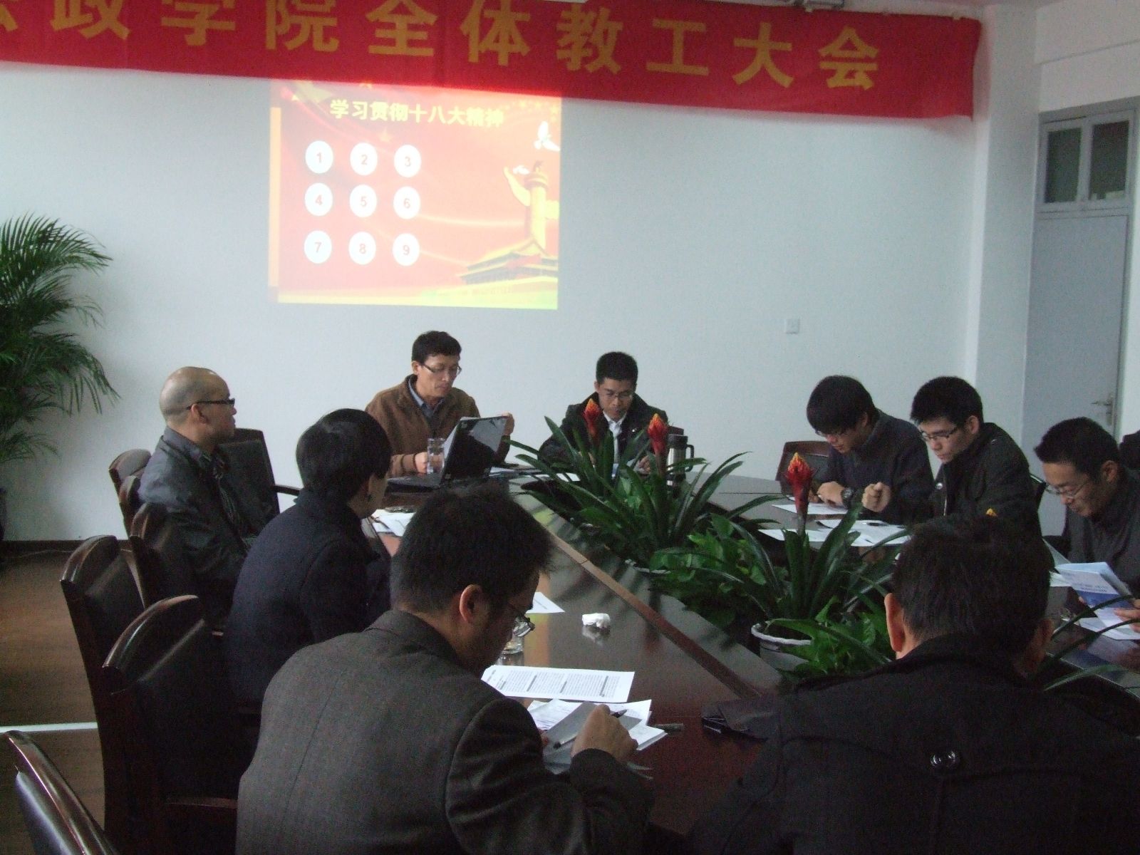 为了更系统地学习落实十八大精神,根据学校党委《中共体育博彩 委员会关于认真学习宣传贯彻党的十八大精神的通知》,11月28日法政学院召开全院教职工大会专题学习十八大精神。专题学习会由学院党总支书记王柏民主持。