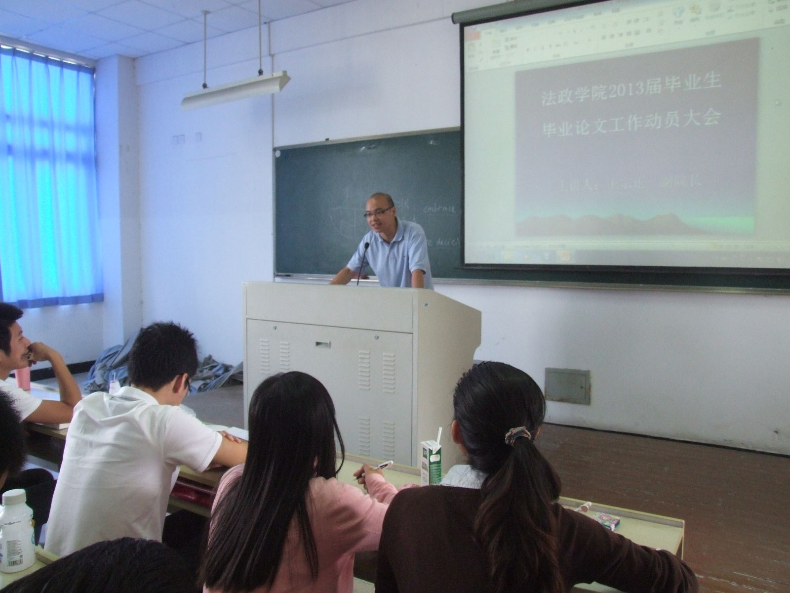 为了让毕业生进一步明确毕业论文要求,确保毕业论文工作顺利进行,2012年10月10日上午,法政学院在2号楼20教室召开了2013届毕业生的毕业论文动员大会。法政学院副院长王宗正教授、教学科夏小娜老师以及学院近200名毕业生参加了本次动员大会,会议由副院长王宗正教授主讲。