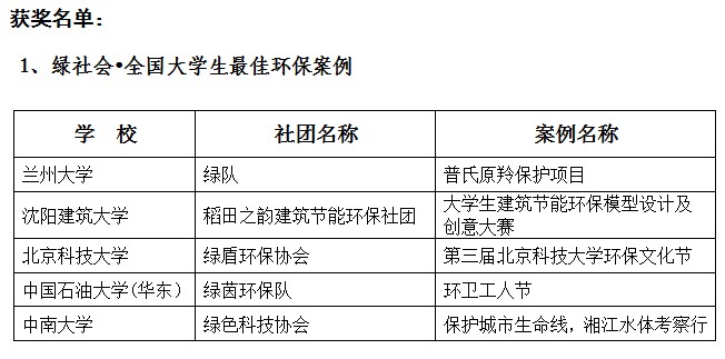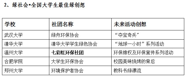 在活动中,体育博彩平台 七彩虹环保社团(七彩虹环保法治联盟)荣获"绿社会•全国大学生最佳绿创想"奖。此次在全国各高校环保社团提交的方案中共评出5个"绿社会•全国大学生最佳环保案例"奖和5个"绿社会•全国大学生最佳绿创想",获奖名单如下: