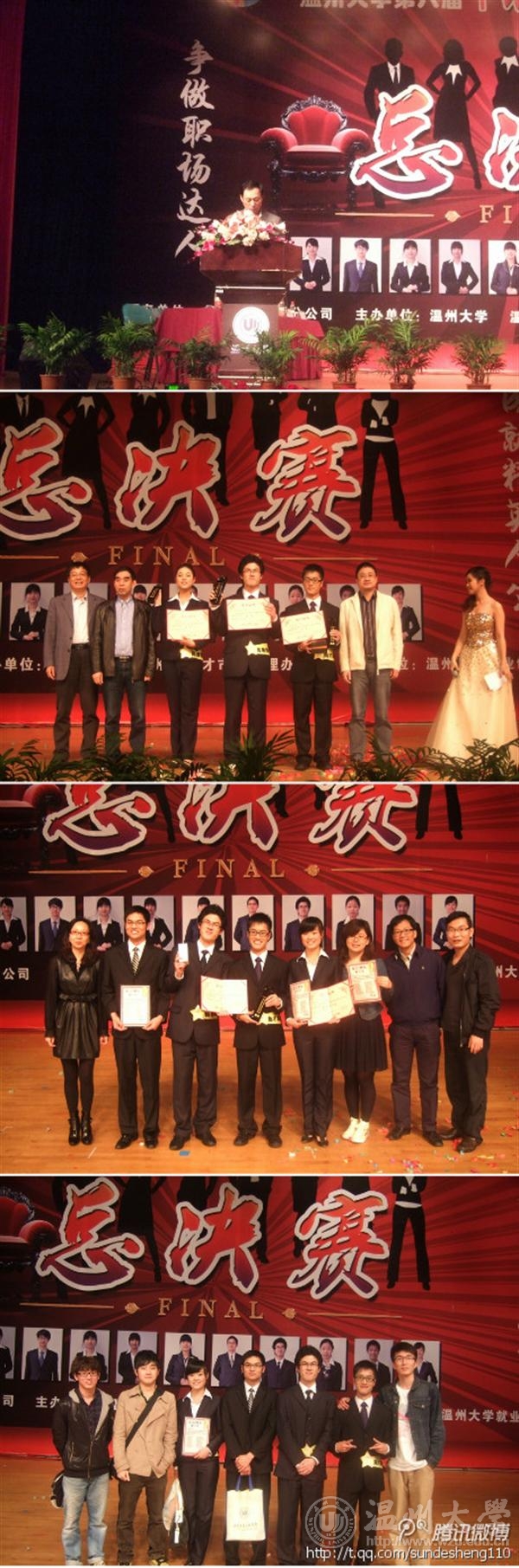 4月14日晚,温州市第二届暨体育博彩 第八届职场精英挑战大赛总决赛在大学生活动中心演艺厅隆重开赛。校党委副书记牟德刚、校就业处领导、多家赞助商代表和各学院师生共同观赛。法政学院党总支副书记严玲红、学生科科长杨振海、团委书记孙德升和学院各班级代表全程观看比赛、为学院选手加油鼓劲。