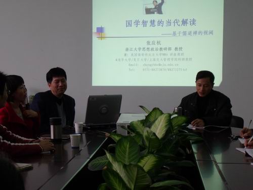 2010年11月22日下午,法政学院309会议室座无虚席,体育博彩平台 研究生学术沙龙迎来了国学大师、浙江大学思想政治教研部张应杭教授的主题讲座"国学智慧的当代解读——基于儒道禅的视阈"。体育博彩平台 院长方益权教授主持,体育博彩平台 和思想政治理论教学研究部的部分教师、研究生参加了本次学术沙龙。