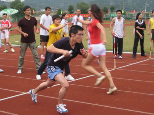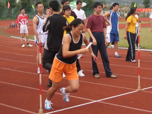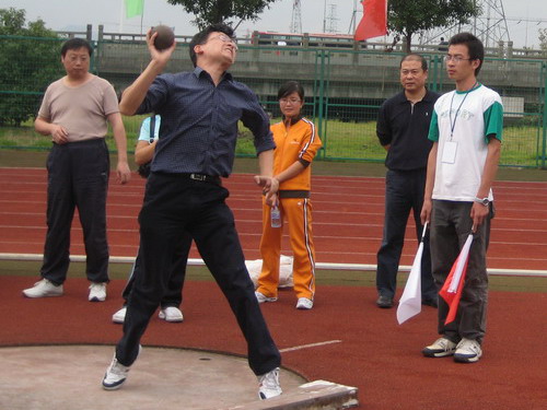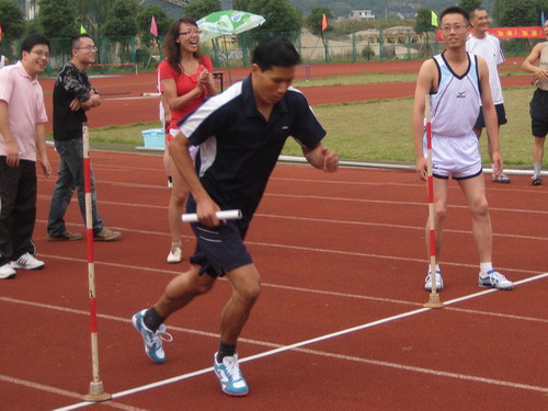 共有32名教工参加了本届运动会,上演了一幕幕激动人心的场面:在垒球投准比赛中,英姿飒爽的杨晓虹、余蕙老师以优美的动作,将球准确地抛向圆心,现场掌声一片。最终,杨晓虹老师以无可争议的实力夺得冠军。在跳远比赛中,胡小平和付德军两位老师分获二、三名。在10×80米的比赛中,吴志敏、钭晓东、骆徽、孙慧等十位老师脚穿清一色的钉鞋凛然登场,经过狂奔和追赶,最终取得了第六名,实现了集体项目上难能可贵的突破,现场一片狂欢。