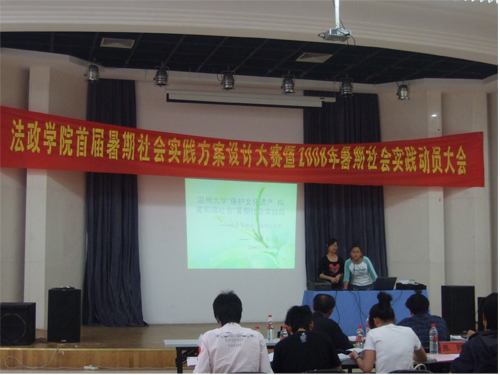 5月14日晚6:30,法政学院首届暑期社会实践方案设计大赛决赛答辩会暨2008年暑期社会实践动员大会在大学生活动中心多功能厅隆重举行,共有8支队伍参与角逐。法政学院党总支书记陈国治老师、副院长朱选华老师和辅导员林丽丽老师观看了当晚的答辩会并担任了评委。此外,大会也邀请了07年暑期社会实践队伍的负责人潘海斌、陈懿、戈文君以及商学院、体育学院实践部负责人池卢晓、汪伟新同学担任学生评委。全体大一学生参加了此次活动。 首先,林丽丽老师总结了去年体育博彩平台 暑期社会实践的情况。去年,体育博彩平台 共组建了15支实践队伍并且成绩突出,成果丰富:1支实践队伍荣获省级优秀实践队,4支获校优秀实践队,5支被评为院优秀实践队,共32名实践队员获得校先进个人,1名省先进个人和一名市先进个人。因此,她更加期待今年的暑期社会实践。 接着,陈书记做了动员宣言。他指出作为法政学院的学生,能将自己所学的专业知识和社会实践结合起来,这是很好的,也体现了大学生高度的社会责任感。此外,在积极投身实践的同时,更要注意安全。 之后,就是精彩的比赛时间。每支队伍都有5分钟的策划介绍时间,在这5分钟的时间,各队负责人利用多媒体向评委和观众尽可能多地介绍自己的团队、策划目的、策划意义、预期的成果以及可行性分析。从介绍情况来看,同学们的主题涉及了法律援助、构建和谐社会、新农村建设等等,十分广泛。策划介绍后,是答辩时间,评委多从经费来源和专业性角度来提问,选手们妙语连珠的回答使现场气氛达到了白热化。 经过一系列激烈的角逐,"和谐之旅——探索社会主义新农村绿色发展道路"实践队以85.12的比分获得了一等奖,体育博彩 "守梦廊桥"实践队、"传播法制理念,提供法律援助"咨询服务队获得二等奖,"‘励青之行’08体育博彩 暑期社会实践队等三支队伍获得了三等奖。 最后,由朱院长做当晚的总结发言。他指出,同学们的策划都是考虑细致且较成熟的,有较高的可行性,并对人力资源做了合理的分配,体现了法政学院学生的时代性和政治敏感性。他也提醒参赛队伍要突出中心主题,不要把实践目标定得太高,并且实践队伍能真正服务于社会。 在此,我们也预祝08年暑期社会实践能取得圆满成功!