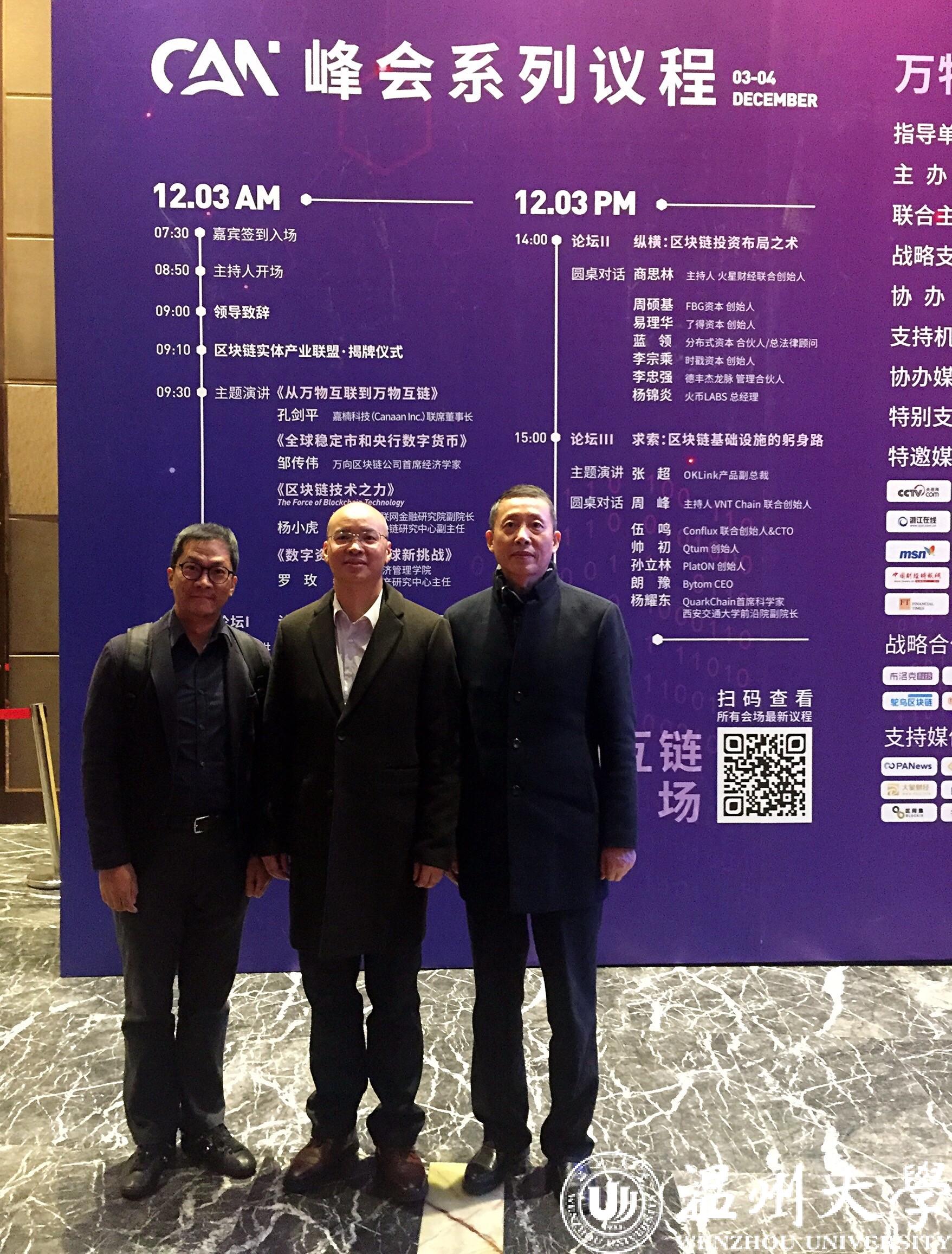 12月3日,体育博彩平台 院长王宗正、党委书记林钦、副书记杨振海一行,受杭州嘉楠耘智信息科技有限公司联席董事长孔建平(系体育博彩平台 2008届法学专业优秀校友)邀请参加2019CAN大会·万物互链·区块链与全球经济新格局峰会。此次大会由杭州市人民政府为指导单位,CAN大会组委会联合嘉楠科技和浙江清华长三角研究院杭州分院主办。本届大会以促进区块链技术革新、产业变革、生态协同发展为宗旨,引领经济创新、转型升级。大会邀请了近百名政府领导、业内著名专家学者、行业权威、投资机构和上市公司嘉宾。会上,杭州嘉楠耘智信息科技有限公司联席董事长孔建平受邀作《从万物互联到万物互链》的主题演讲。
