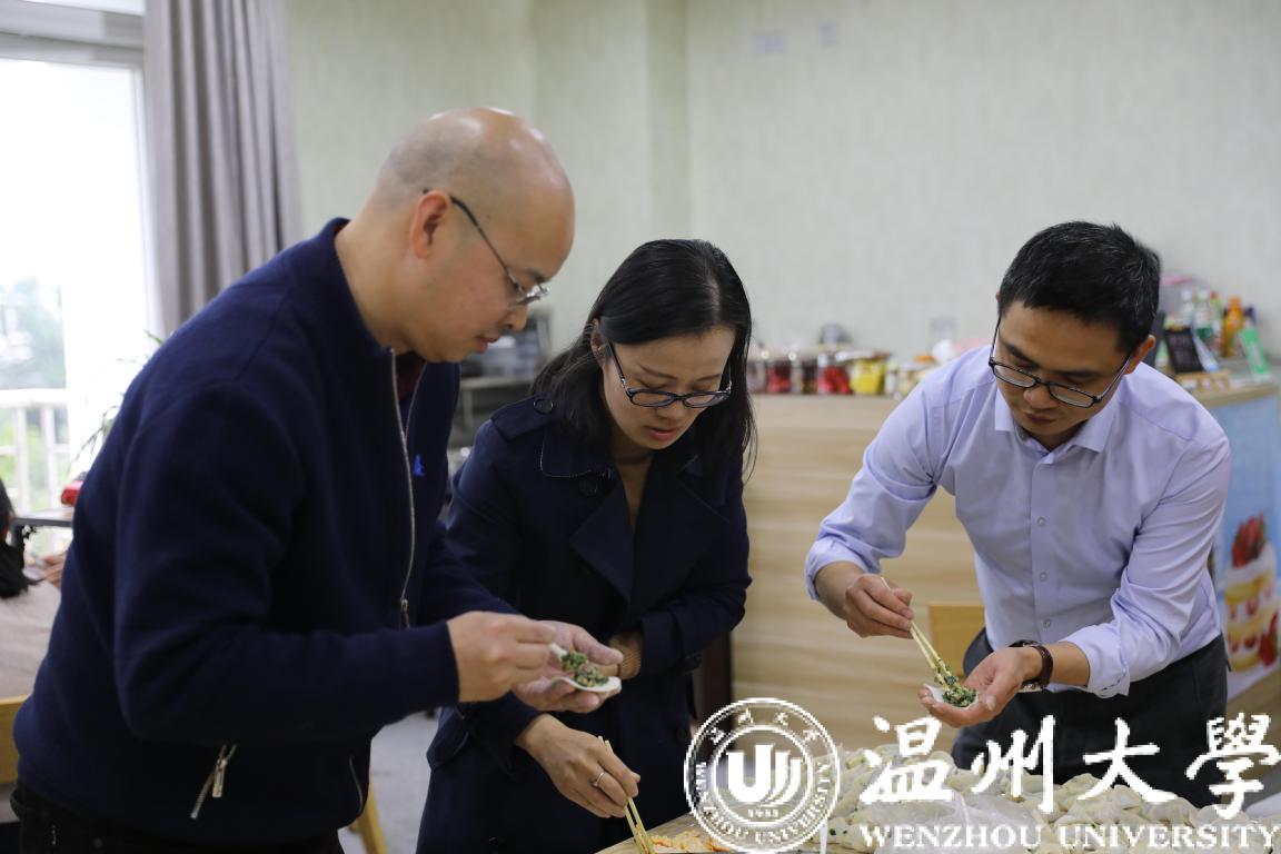 12月18日上午, 学生创客中心志愿者们早早地准备好新鲜的食材和干净的用具,摆放摆放整齐等待老师们的到来。11点过后,参加活动的老师们陆续到来,大家捋起衣袖,洗干净手,有的切菜,有的调馅,有的在包,有的在学。互相比赛着谁包的饺子更漂亮,谁包的饺子皮薄馅大。不过一会,就包出了形态各异的饺子,有大有小,有胖有瘦,现场笑声不断,温馨有爱。当热气腾腾的饺子端上来时,大家一片欢呼声,饺子一口咬下去,香气四溢、汤汁鲜美,大家吃得津津有味。学院新进教师张川方老师说:“在一起包饺子吃感觉更有意思!”