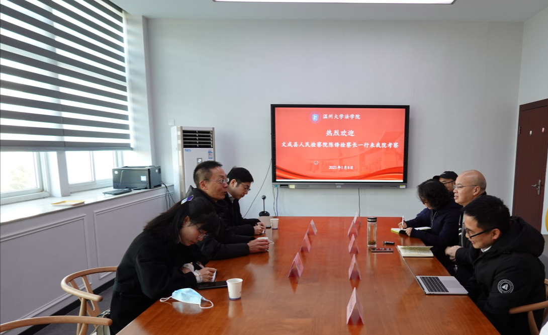 2021年1月8日上午,文成县人民检察院陈锋检察长、副检察长陈伟银、苗东欣一行三人来访体育博彩平台 ,在参观体育博彩平台 后双方在体育博彩平台 314会议室举行了座谈会。体育博彩平台 王宗正院长、缪心毫副院长、谢丽珍老师、肖磊老师、周浩仁老师参加座谈。