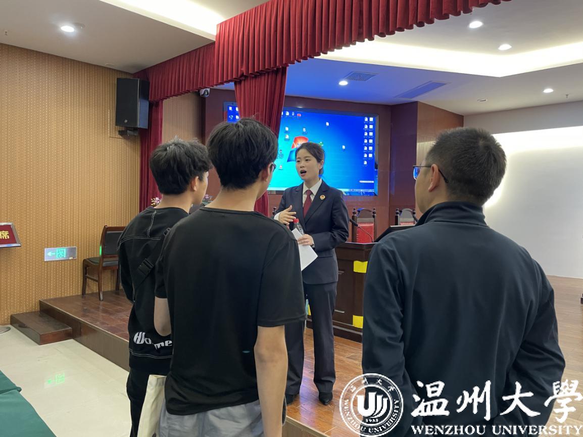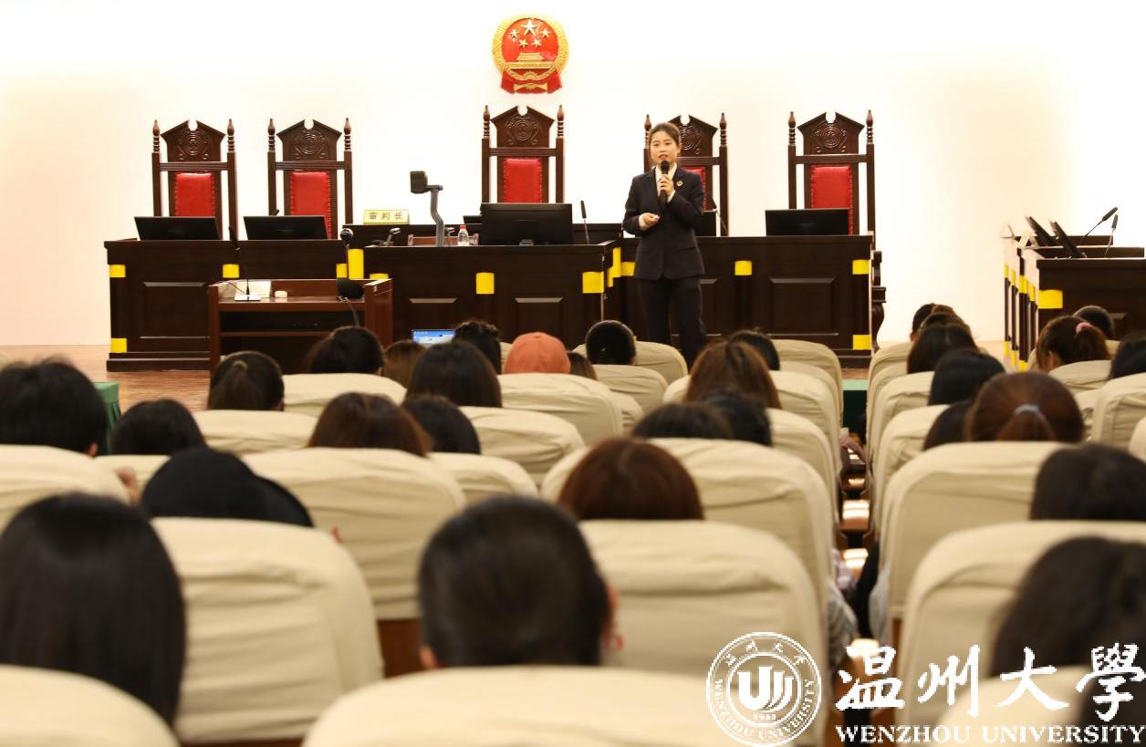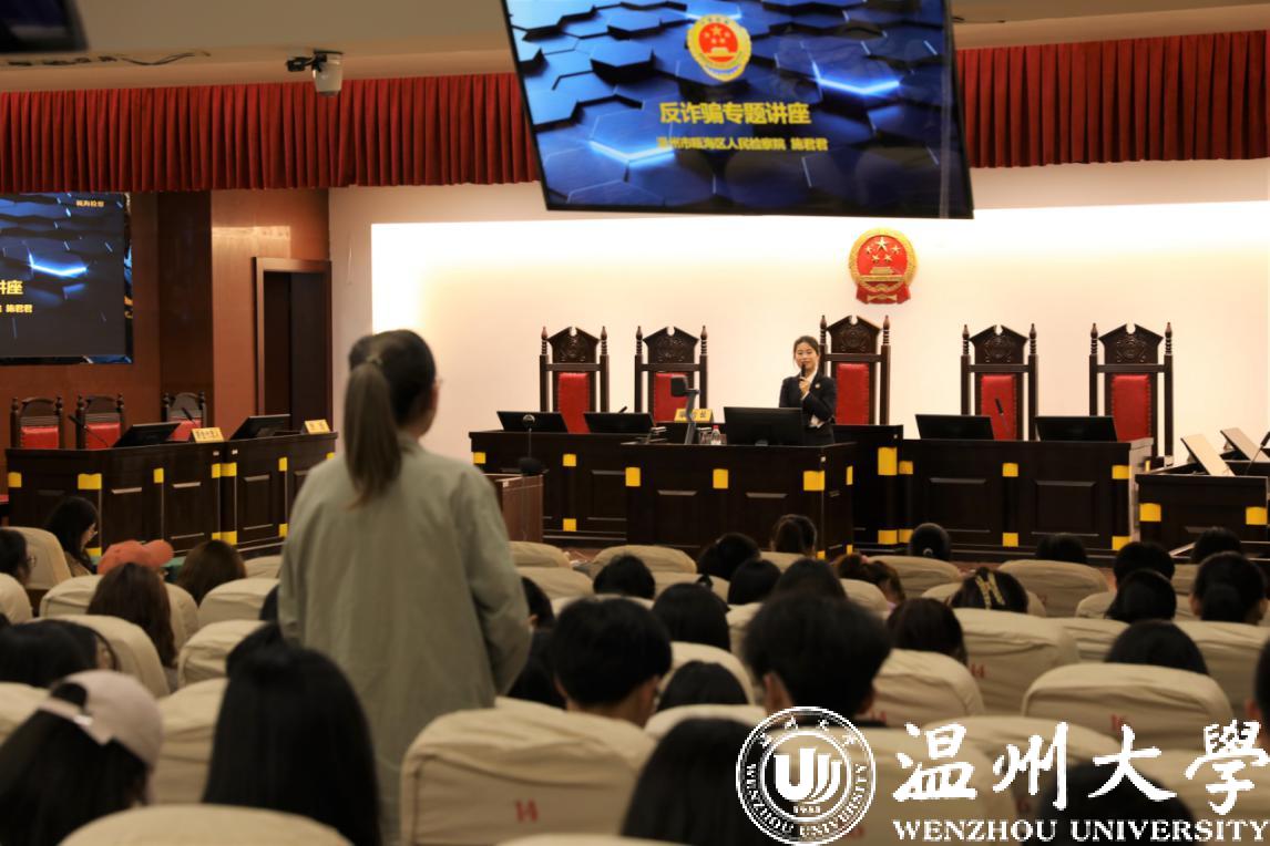 为切实做好安全宣传教育,增强学生防诈反诈意识,营造平安和谐的校园环境,4月7日下午,体育博彩平台 于北校区模拟法庭组织了防诈骗专题讲座。讲座由林丽丽老师主持,特别邀请到温州市瓯海区人民检察院检察官施君君为同学们主讲。
