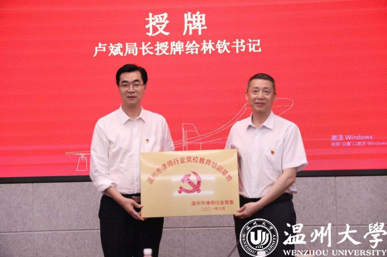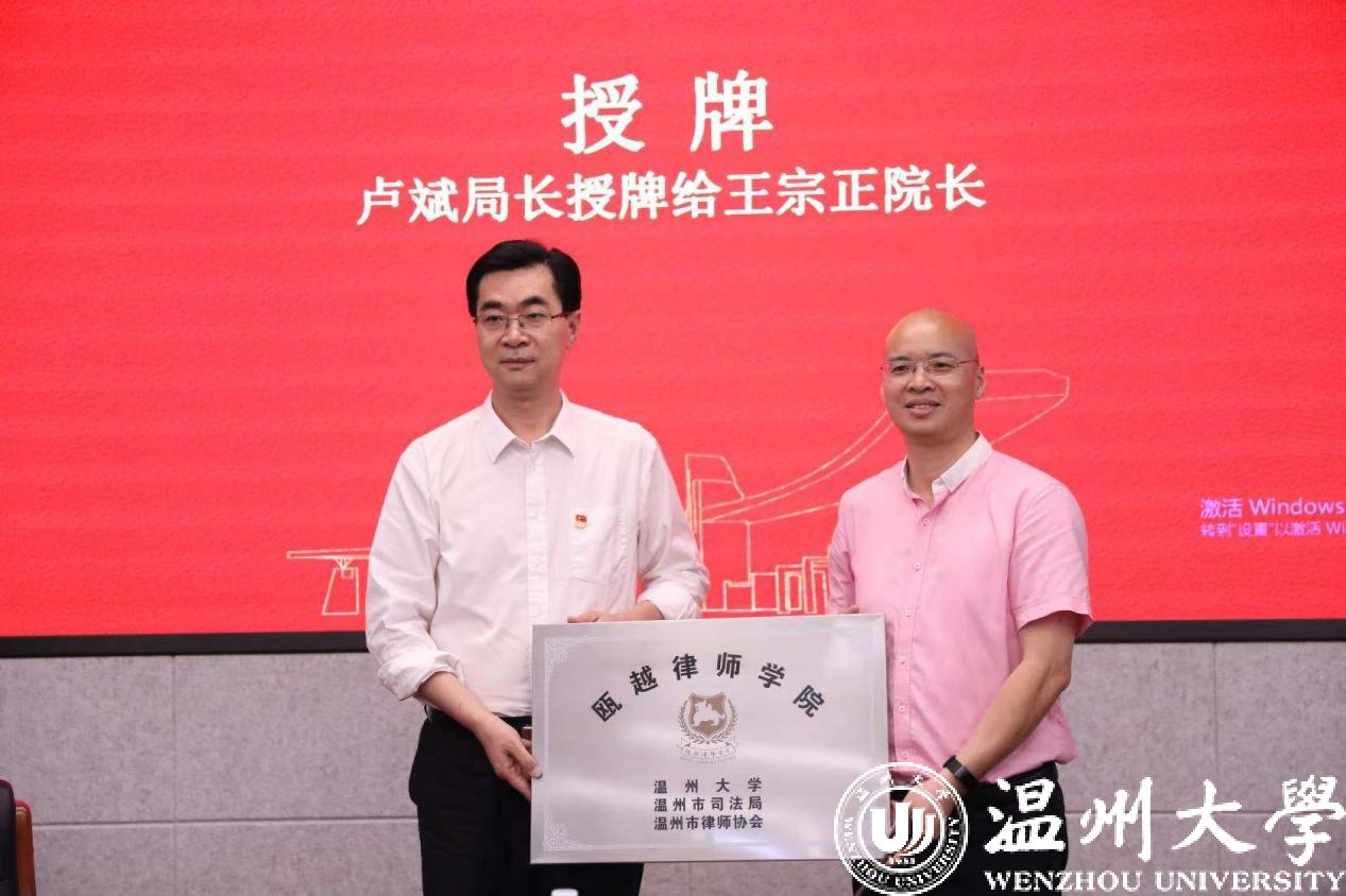 仪式上,林向光副局长、叶连友会长和周湖勇副院长分别代表温州市司法局、温州市律师协会、体育博彩 签署了合作设立瓯越律师学院协议。卢斌局长向王宗正院长授瓯越律师学院牌匾、向林钦书记授温州市律师行业党校教育培训基地牌匾。