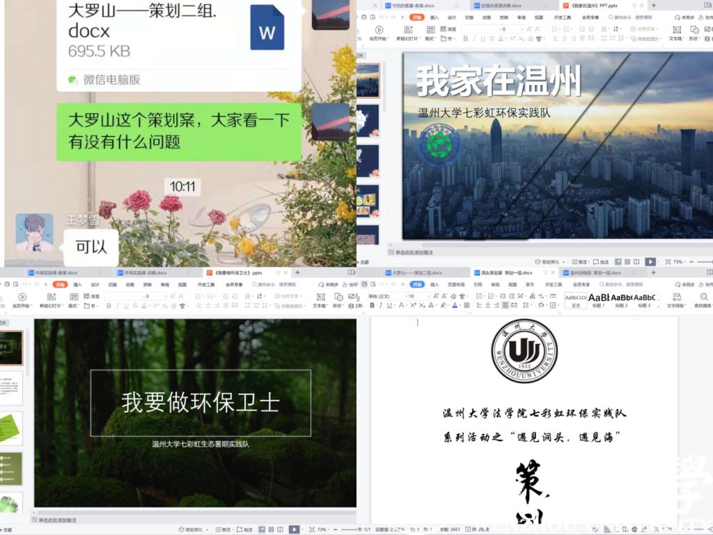 本支实践队分为制作环保教案的教育组和策划生态研学的策划组两组。其中,教育组完成了九份环境教育课堂PPT与讲稿制作,内容涵盖珍惜水资源、可怕的雾霾、我家在温州等;策划组完成了六份生态研学的策划案,内容包括大罗山、洞头、三垟湿地等生态环保地。