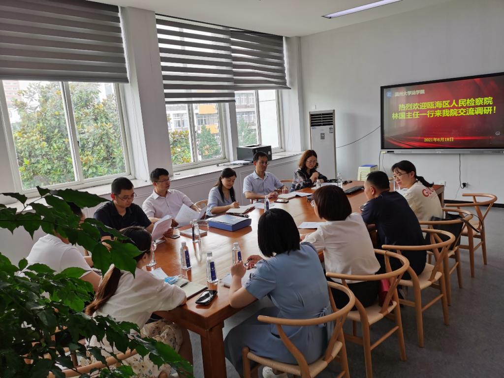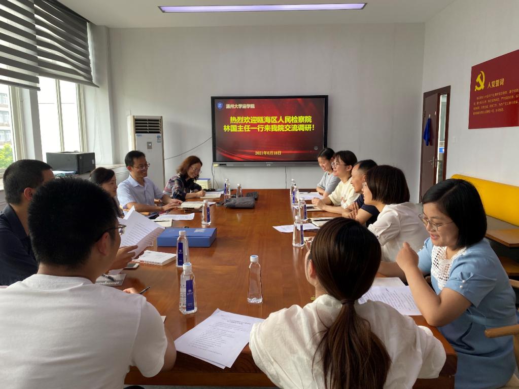 6月18日上午,瓯海区人民检察院第七检察部林国主任一行七人到体育博彩平台 进行考察交流,体育博彩平台 法律系何平副教授、谢丽珍副教授、李勇军副教授、胡剑波副教授和柯宇航博士等参加座谈。