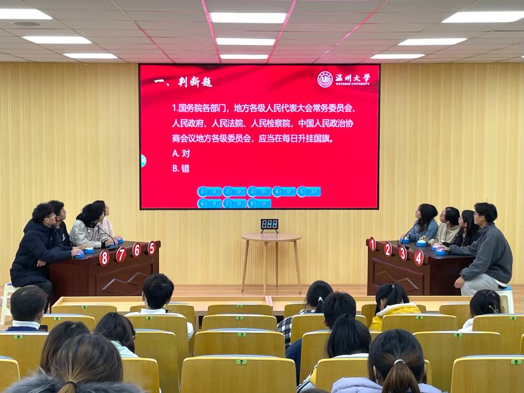 12月1日,“宪法宣传周”系列活动之“习近平法治思想”知识竞赛在体育博彩 北校区举行。知识竞赛重点围绕习近平法治思想相关内容,设有判断题、单选题、多选题和逻辑题。700余名学生参与到了知识竞赛初赛环节,最终选出24名选手进入决赛。决赛现场紧张刺激,答对得分、答错扣分的竞赛机制也为比赛增加了更大的悬念。知识竞赛充分检验了大学生对习近平法治思想、宪法知识的掌握程度,将法治学习的知识性与趣味性融为一体。