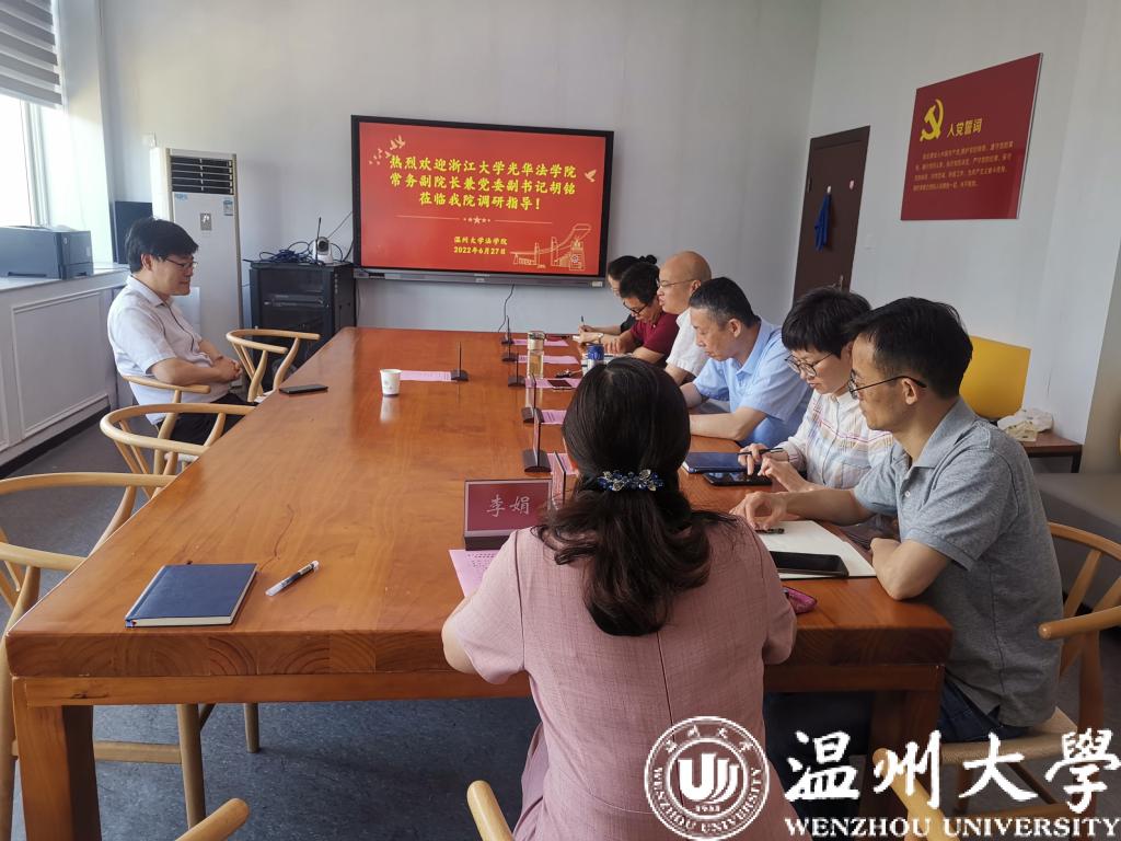6月27日上午,浙江大学光华体育博彩平台 常务副院长兼党委副书记胡铭莅临体育博彩平台 调研指导,学院院长王宗正等领导和法学相关系主任出席座谈会。