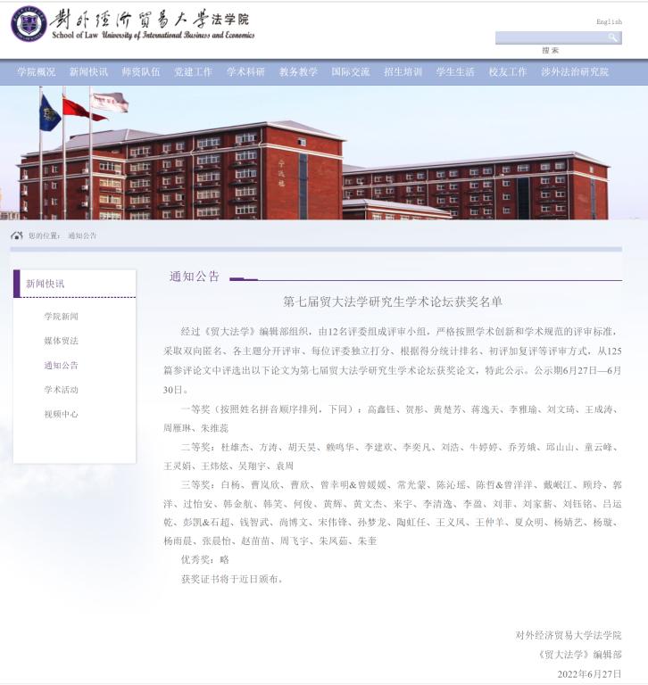 附 对外经济贸易大学体育博彩平台 “第七届贸大法学研究生学术论坛获奖名单”链接: