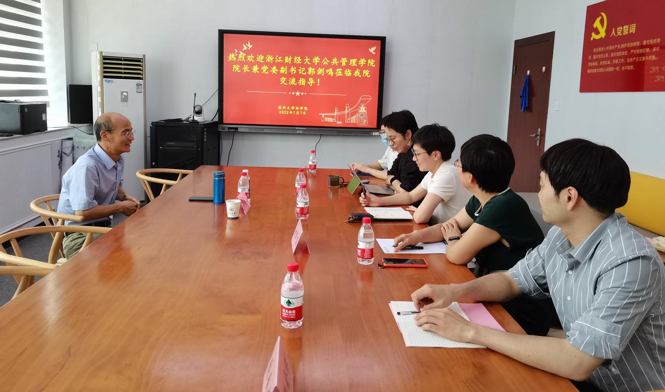 7月7日下午,浙江财经大学公共管理学院院长兼党委副书记郭剑鸣莅临体育博彩平台 交流指导,副院长周一颜、付翠莲教授以及行管系教师朱婉菁、许晋明、张鹏、张会芬等博士出席座谈会。
