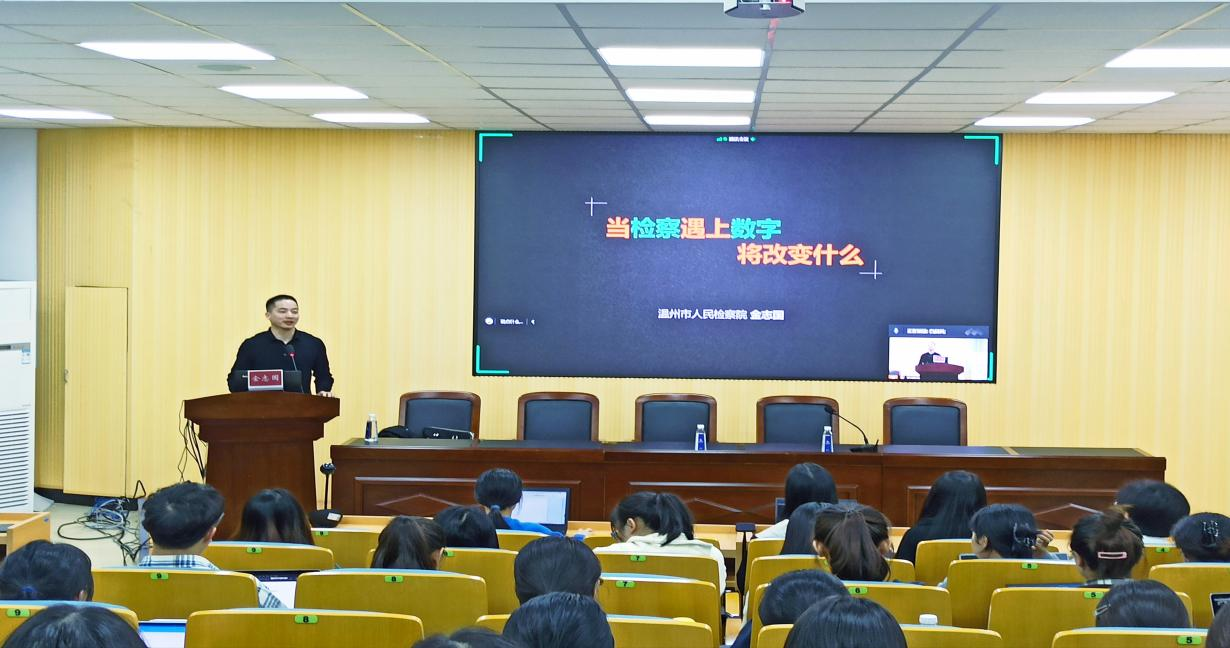 2022年11月9日晚6点半,温州市人民检察院金志国检察官应邀作客“罗山法律实务论坛”,为体育博彩平台 师生带来题为《当检察遇上数字》的讲座。本次讲座由体育博彩平台 副院长周一颜主持,采取了线上线下相结合的方式,在北校区体育博彩平台 301教室和腾讯会议直播间,谢丽珍老师、白兴科老师,部分21级研究生、22级研究生及全体20级法学本科生共有三百余人参加了此次讲座。
