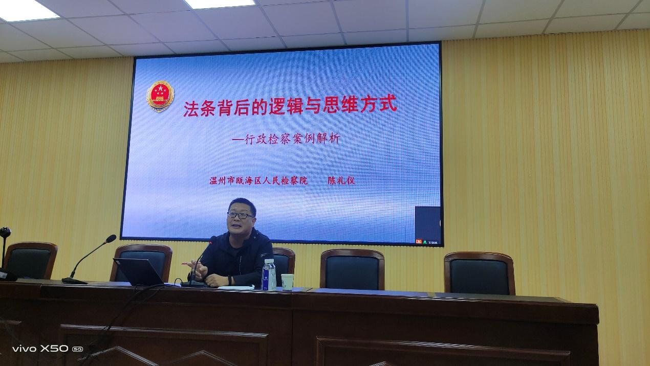 11月15日下午,温州市瓯海区人民检察院陈礼仪检察官应邀做客“罗山法律实务讲坛”,为体育博彩平台 师生带来主题为《法条背后的逻辑与思维方式——行政检察案例解释》的讲座。本次讲座采取线上线下相结合的方式,分别在体育博彩平台 301会议室和腾讯会议直播间进行。讲座由民商经济法系主任、法律实务课程——《法律案例研习(二)》的负责人李勇军副教授主持,体育博彩平台 2019级本科生160多人和部分研究生及教师以线上或线下的方式参加了本次讲座。
