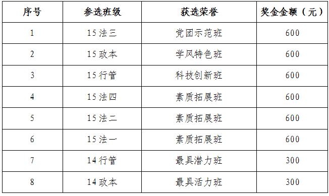 体育博彩平台 于2016年11月14日开展了法政学院第九届特色班级评选,现将获选班级和班级建设奖金公布如下: