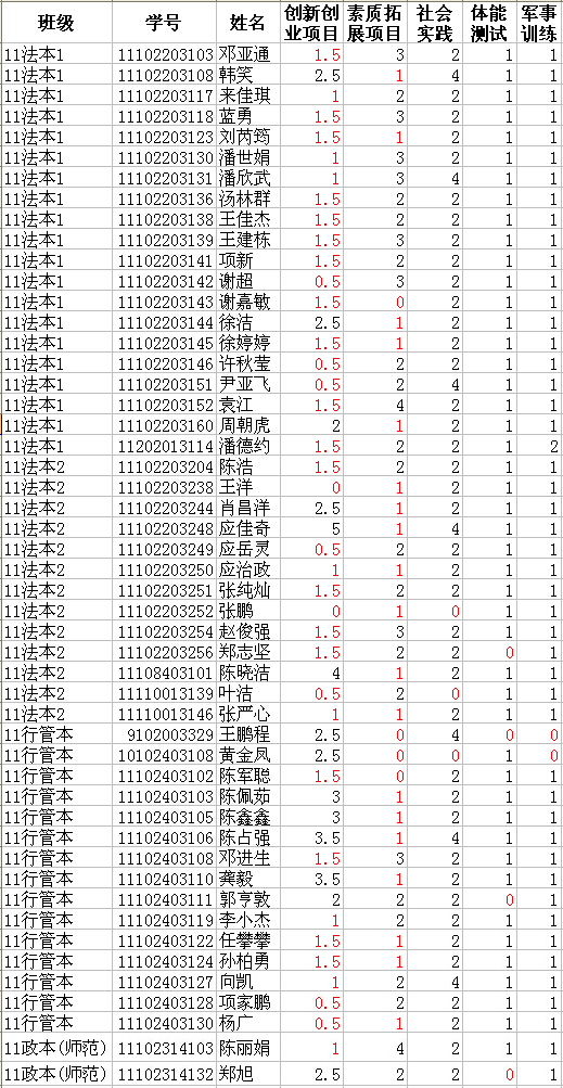 截止2015年1月9日,学校各部门已将本学期申报、补报的所有项目录入课外学分系统。体育博彩平台 11级毕业班还有50个同学的课外学分未修满,具体名单如下表。