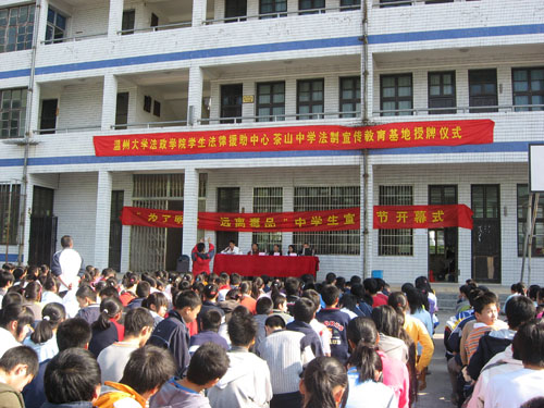 | 4月18日下午,体育博彩 法政学院学生法律援助中心茶山中学法制教育基地授牌仪式暨"为了明天、远离毒品"中学生宣教节开幕仪式在茶山中学举行。法政学院副院长朱选华老师、辅导员林丽丽老师、茶山中学蔡振堂校长以及温州市公安局禁毒大队李仲芳警官出席了此次仪式。 下午3:30,主持人准时宣布仪式正式开始,茶山中学蔡校长和体育博彩平台 朱副院长分别作了重要讲话。蔡校长强调了加强学生法制观念的重要性,并寄予了学生们美好的希望。朱院长也表示十分愿意加强两校之间的联系,希望法律援助中心能够给予同学们更多的法律帮助。在热烈的掌声中,双方交换了合作协议书,并由副院长揭牌授予茶山中学,这标志着两校的合作关系正式建立。 在授牌之后,应法政学院之邀的李仲芳警官给同学们作了禁毒宣传教育讲座。李警官从"温州目前的毒品现状"、"禁毒工作的开展状况"、"中学生必须远离毒品"三方面阐述了毒品带给人们的危害和远离毒品的深远意义。李警官最后语重心长地希望中学生们远离毒品,坚决地与反毒行为作斗争。 活动是法政学院学生法律援助中心为茶山中学提供法律援助,加强中学生法制观念系列活动的一个开端。双方将在下阶段继续保持合作关系。 学生法律援助中心 何卫红 2007.4.20